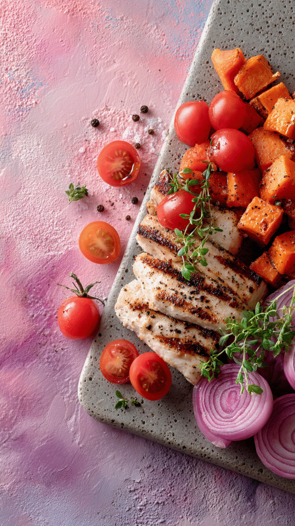 - Balanced build: Carbs from sweet potato and rice, protein from chicken, healthy fats from olive oil, fiber from veggies.